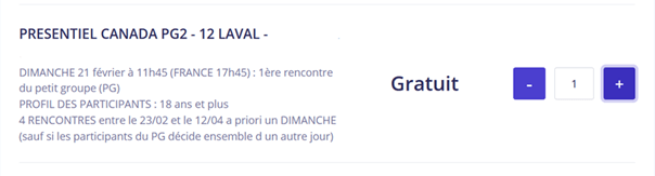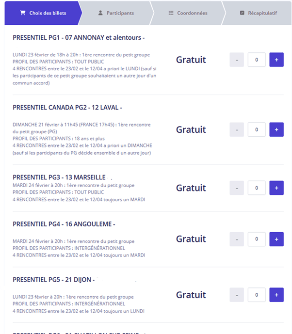 Étape 2 : Sélectionner son petit groupe en renseignant le nombre de place que je réserve. 1 place si je suis seul(e) à m’inscrire et jusqu’à 4 si j’inscris d’autres personnes avec moi