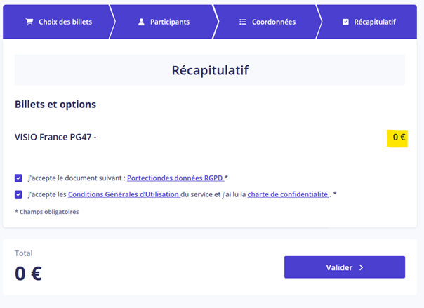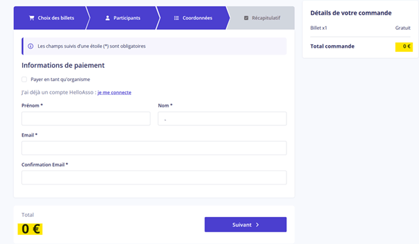 Étape 5 : Je renseigne mes coordonnées de paiement bien que le total soit 0 euro donc gratuit. Le mail communiqué à cette étape recevra la confirmation d’inscription